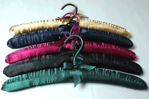 Multi Jewel Tone Satin Padded Hangers Set of 5 - B004AHNBSWSet of five plush jewel tone satin padded hangers are made from the richest material. Decorative and useful. These hangers will preserve the shape of any top and will extend the lifetime of any garment. Each Satin Hanger is 15 1/2 inchs in